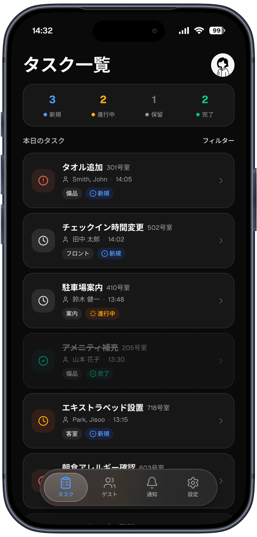 フロント → 客室 → 施設管理の受け渡しが口頭や内線で行われ、標準化されていない。完了責任が曖昧になる。
